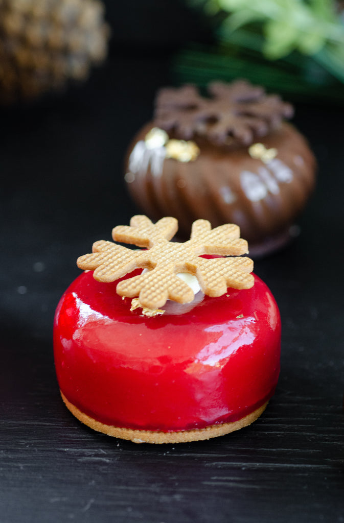 Ingrédients : crème 35 %, beurre, sucre, framboises, œufs, mascarpone, farine, chocolat inspiration framboise, épinette, jus de lime, beurre de cacao, poudre à pâte, pectine NH et gélatine