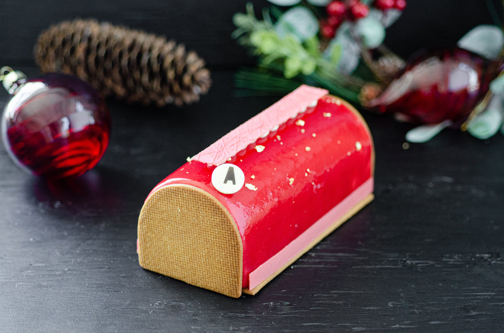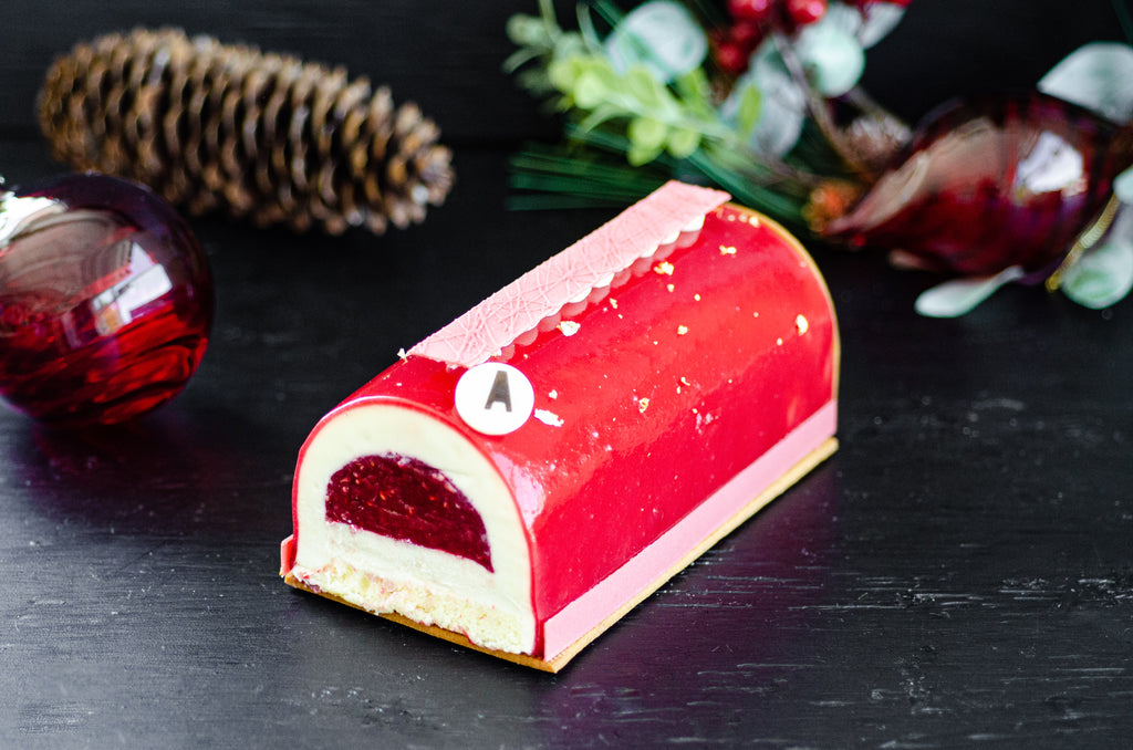 Bûche composée d’un biscuit madeleine à la lime, d’un croustillant, d’un cœur framboise et d’une mousse mascarpone à l'épinette.