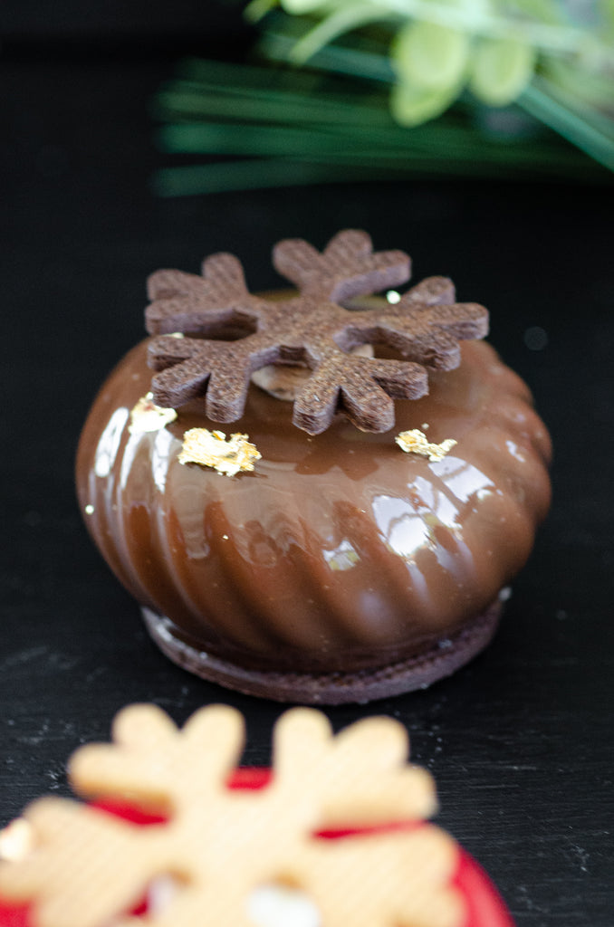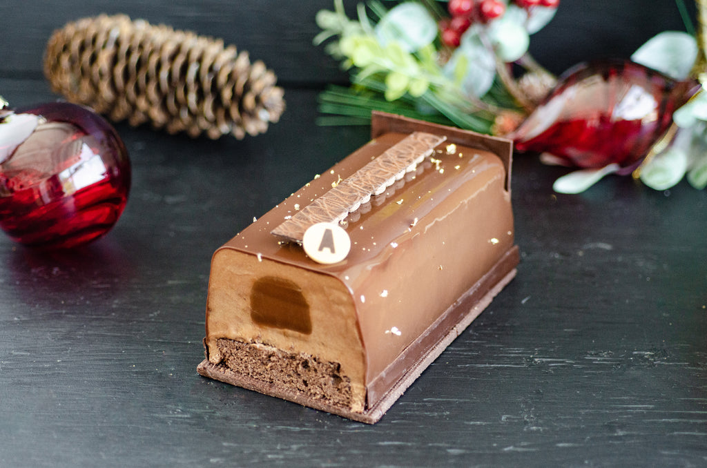 Bûche composée d’un biscuit au chocolat, d’un cœur caramel et fleur de sel, d’une mousse au chocolat 64% et d’une pâte sablée au chocolat.